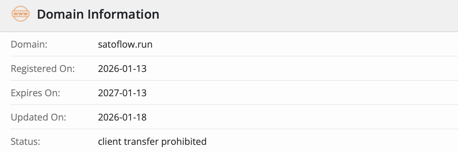 У Satoflow Run есть несколько ярких «симптомов» примитивного лохотрона, ориентированного на самых доверчивых. Начнем с даты запуска сайта, который был зарегистрирован 19 января 2026 года: на момент написания обзора он работает фактически пару недель. Для платформы, которая якобы торгует криптой и приносит доход, это слишком короткий срок — нормальные проекты живут годами, а не исчезают через месяц.