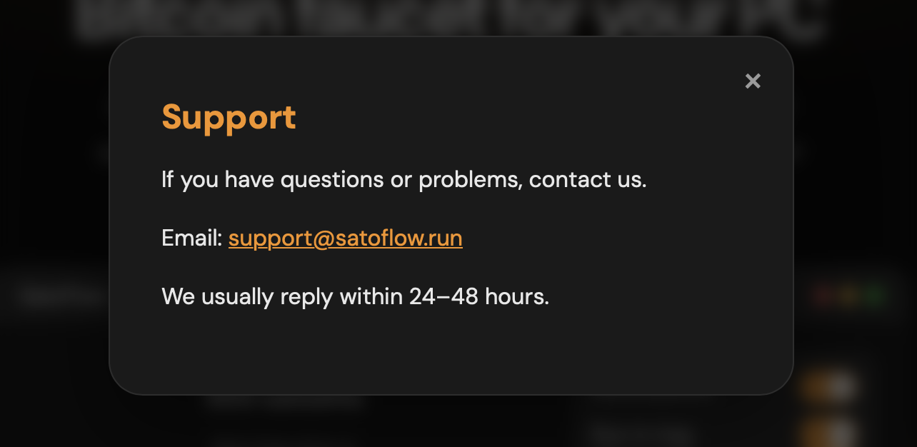 Сайт выполнен предельно просто: на его странице есть только личный кабинет и форма регистрации. Никаких Telegram-каналов и аккаунтов в социальных сетях у проекта не наблюдается. Есть только почта для связи support satoflow run и чат поддержки прямо на сайте. Это уже настораживает: серьезные проекты обычно имеют хотя бы какой-то живой канал или сообщество, а здесь тишина.