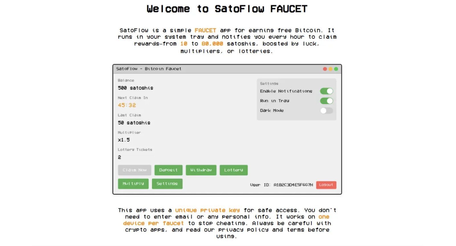 Satoflow предлагает запустить торгового бота, который якобы торгует криптой по готовым алгоритмам. По сути это легкий софт, функционирующий в трее. Программа раз в час уведомляет пользователя о возможности заработать крипту: за один подход якобы можно получить до 100 тысяч сатоши. Иногда бот становится слишком щедрым: пользователям обещают множители, удваивающие профит, проводятся различные лотереи или билеты на дополнительные розыгрыши.