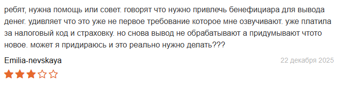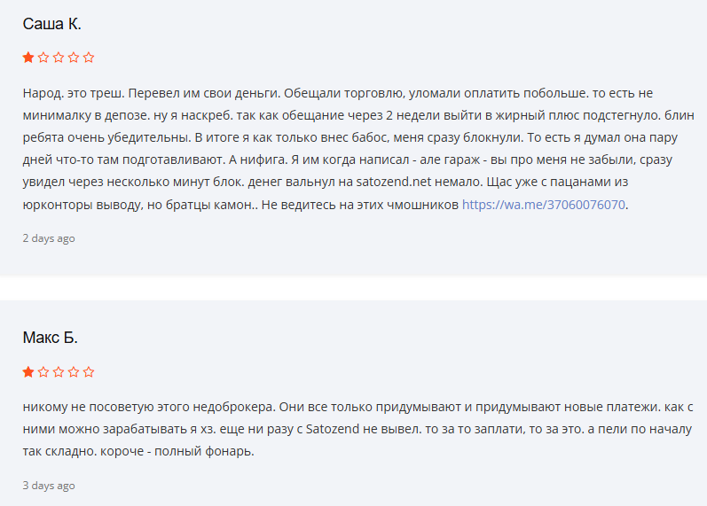Другая клиентка в отзывах о satozend net рассказывает про бесконечные требования. Уже платила за налоговый код. Потом за страховку. Теперь требуют бенефициара. Вывод так и не обработали. Мошенничество чистой воды.