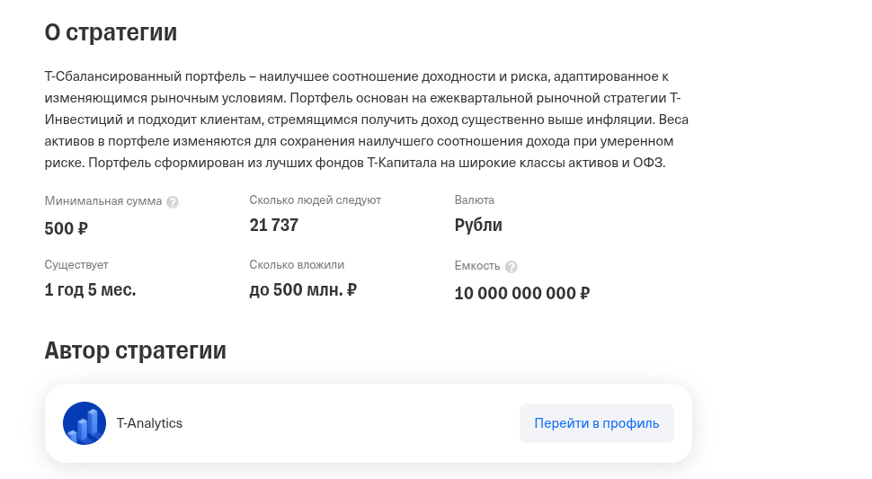 «Т-Сбалансированный портфель» – это флагманская стратегия автоследования от аналитиков Т-Банка. Сами они называют ее идеальным «ленивым» решением для пассивного заработка на бирже.