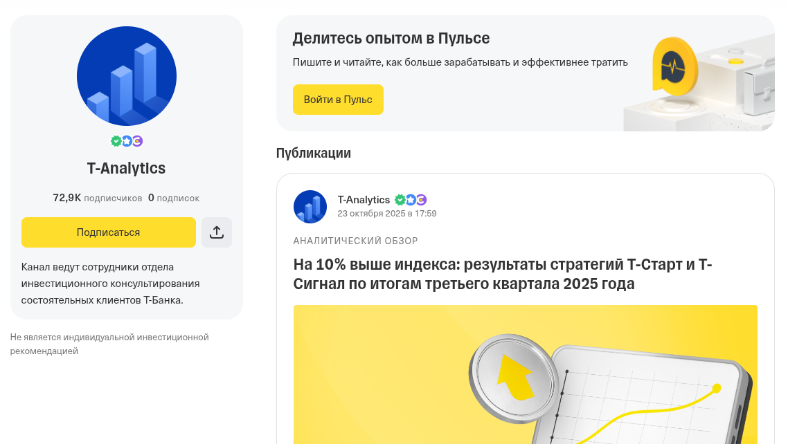 В отличие от сотен анонимных каналов, где «гуру трейдинга» скрывают лица, здесь автором выступает официальное подразделение банка – профиль T-Analytics. Штатная команда аналитиков бывшего Тинькофф (ныне Т-Банк) занимается разработкой инвестиционных идей.