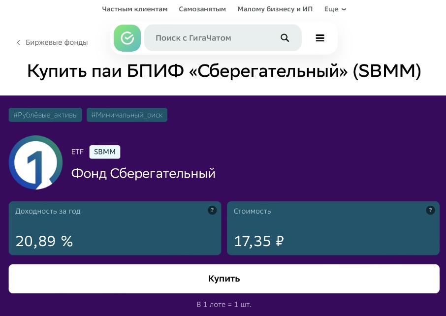 Зайдем сразу на сайт Сбера, где нам предлагают приобрести паи БПИФ УК Первая сберегательный фонд Sbmm по ₽17.35 за штуку с такой же котировкой на бирже Moex.