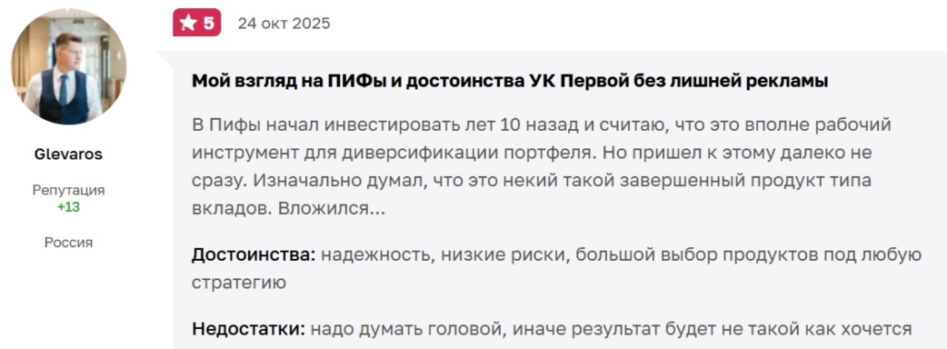 Солидности добавляет тот факт, что в управлении фонда стоит УК Первая, которая функционирует уже около 30 лет и на сегодняшний день управляет средствами вкладчиков на сумму ~₽2380000000000.