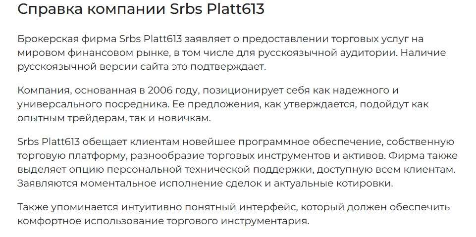 Srbs Platt613 перечисляет свои плюсы: персональная помощь, мгновенное исполнение заявок и точные котировки. Главными достижениями компания считает долгую работу на рынке и удобный интерфейс.