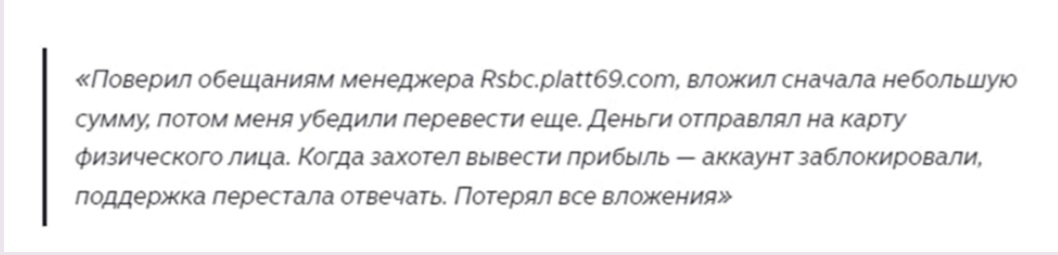Вот конкретный пример. Один из вкладчиков перевёл деньги на карту частного лица, что уже является тревожным сигналом. После этого его аккаунт на платформе заблокировали. Служба поддержки просто перестала отвечать, и человек потерял все свои вложения.