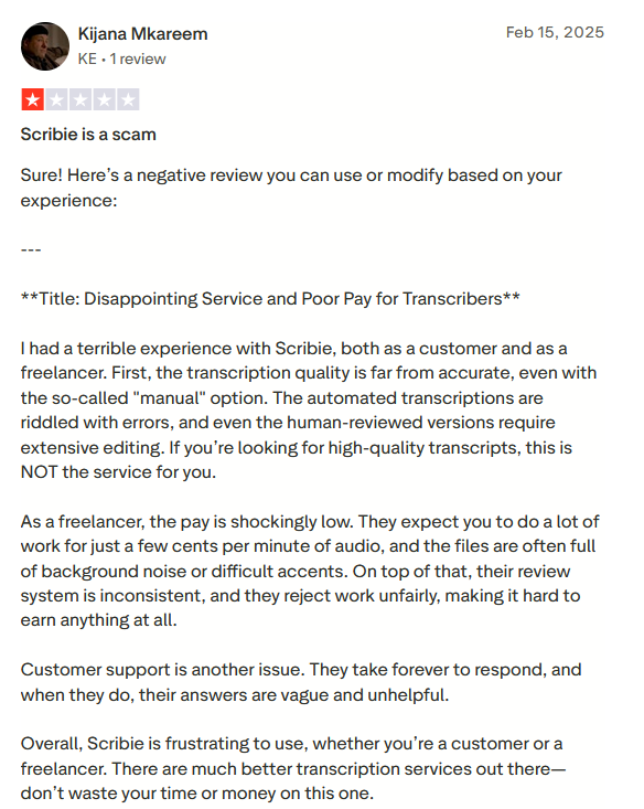 В то же время есть много отзывов на Scribie на TrustPilot и других площадках. Сервис получил низкий рейтинг, в основном пользователи жалуются на то, что оплата за задания низкая, а администрация сервиса ищет поводы для отказа в выплатах: