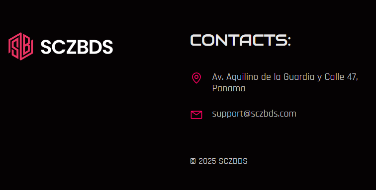 В подвале сайта размещены юридические сведения – судя по всему, деятельность организации регулируется в офшорных юрисдикциях, ведь адрес указан в Панаме. От крупных финансовых регуляторов, наподобие FCA и CySEC, лицензий проект не имеет. Связаться с поддержкой можно, написав на почту support@sczbds com.