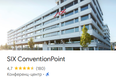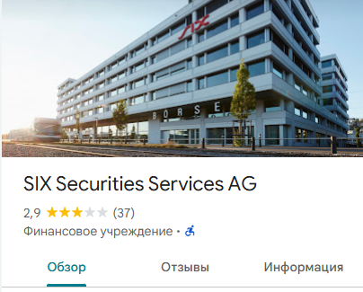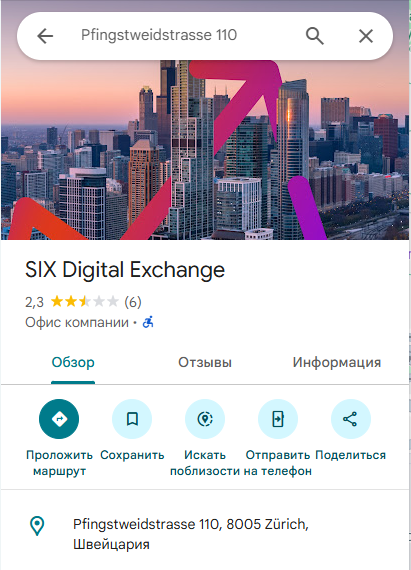 Логотип рассматриваемая в обзоре компания просто своровала. Информацию на карты умышленно нанесли в том же здании, где размещается один из конференц-залов SIX, чтобы ввести пользователей в заблуждение, ведь на фасаде здания при просмотре панорамы улиц видно именно его.