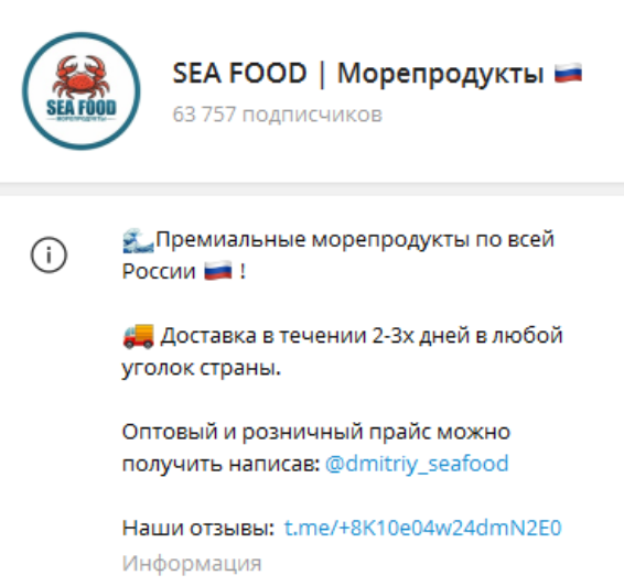 Сразу отметим, что на 25.12.2025 телеграмм-канал «Sea Food | Морепродукты» не работает, но в Интернете о нем много информации и есть данные, что автор регулярно создает новые аналогичные проекты. Так, до заморозки ресурса в нем было 63 757 подписчиков, а в описании говорилось о том, что магазин будет предлагать лишь премиальные дары моря. Сотрудничество предлагается и оптовикам и обычным потребителям.