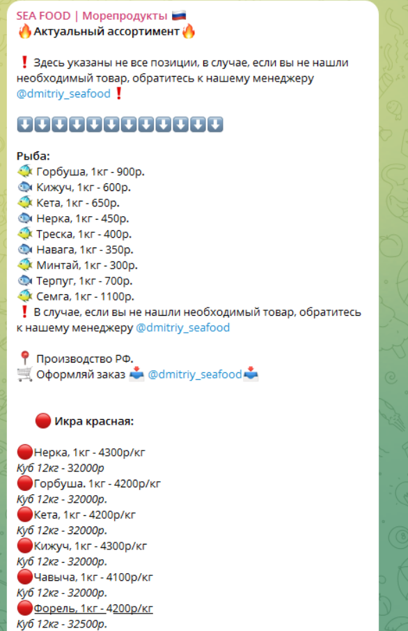 Буквально каждый день в ленте телеграмм-канала в «Sea Food | Морепродукты» админ демонстрирует актуальный ассортимент. Среди товаров предлагается, свежемороженная горбуша, треска, минтай и другая рыба, а также прочие дары моря – икра, креветки, мидии и т.д. Цены, при этом, в 2-3 раза ниже рыночных. В качестве примера, за килограмм икры горбуши просят всего лишь ₽4,200, хотя в официальных магазина стоимость ее превышает ₽13,000.