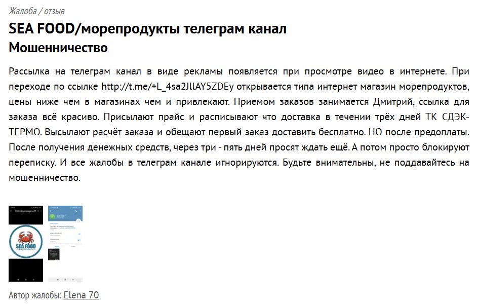 В Интернете на множестве форумов все отзывы о канале «Sea Food | Морепродукты» в Телеграмм отрицательные. В них люди рассказывают свои истории, в которых всегда было описано то, что админ после оплаты блокировал и удалял переписку.