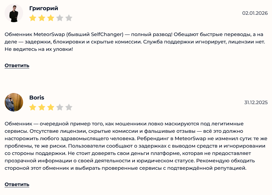 Отзывы Selfchanger, хоть в небольшом количестве, можно найти на сторонних тематических площадках. Там люди пишут, что разработчики пытаются маскироваться под легитимный сервис, но на деле обманывают пользователей и присваивают себе их активы.