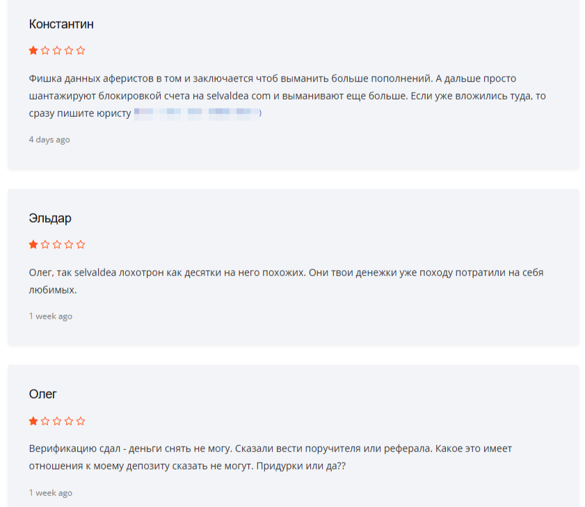 На сторонних веб-сайтах в интернете нами обнаружены только негативные комментарии в адрес посредника Selvaldea. В них брокера обвиняют в обмане трейдеров, блокировках счетов, требованиях выплаты страховок и вымогании средств.