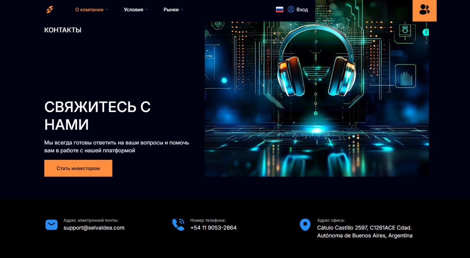 Пользоваться терминалом брокера «Селвалдеа» клиенты могут круглосуточно. Техподдержка торговой платформы работает также 24/7. Для связи с нею предназначен имейл support selvaldea com и номер телефона +54 1905 2864.
