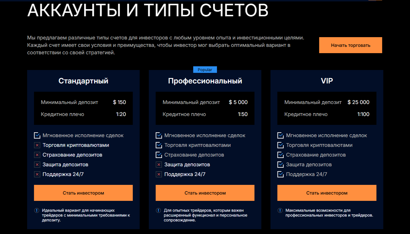 - VIP. Тариф для профи, мгновенное исполнение, защита средств, поддержка 24/7, сделки с криптой, кредитное плечо 1:100, депозит 25 000 долларов.
