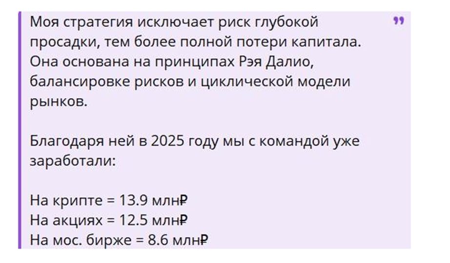 Наш герой утверждает, что торгует по Smart Capital – стратегии, проверенной семьей. Метод основывается на идеологии трейдера и финансиста Рэя Далио, который вывел баланс риска и свою циклическую модель рынка.