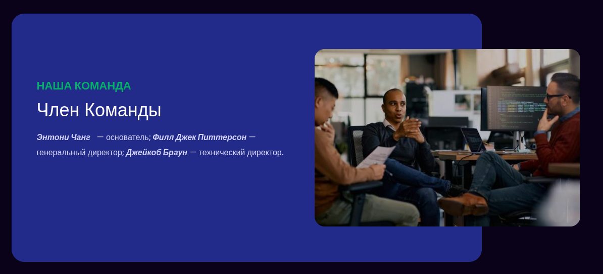Раздел «Наша команда» на главной странице вызывает лишь снисходительную улыбку. Пользователям показывают трех топ-менеджеров: Энтони Чанга, Филла Джека Питтерсона и Джейкоба Брауна. Проблема в том, что фото этих «экспертов» взяты из бесплатных фотостоков. Профилей в соцсетях, публичных выступлений или упоминаний в медиа у руководства компании нет. По сути, нам демонстрируют фейковых персонажей с вымышленными именами.