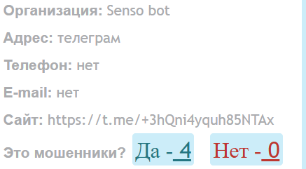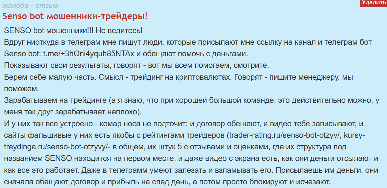 В сети уже начали появляться отзывы о Sensa bot, где пользователи называют сервис мошенническим. Проект предлагает участие в трейдинге и пампах криптовалют. Сотрудники обещают выплату больших процентов от депозита уже на следующий день после внесения средств. Однако после перевода люди сталкиваются с блокировкой аккаунта и исчезновением контактов.