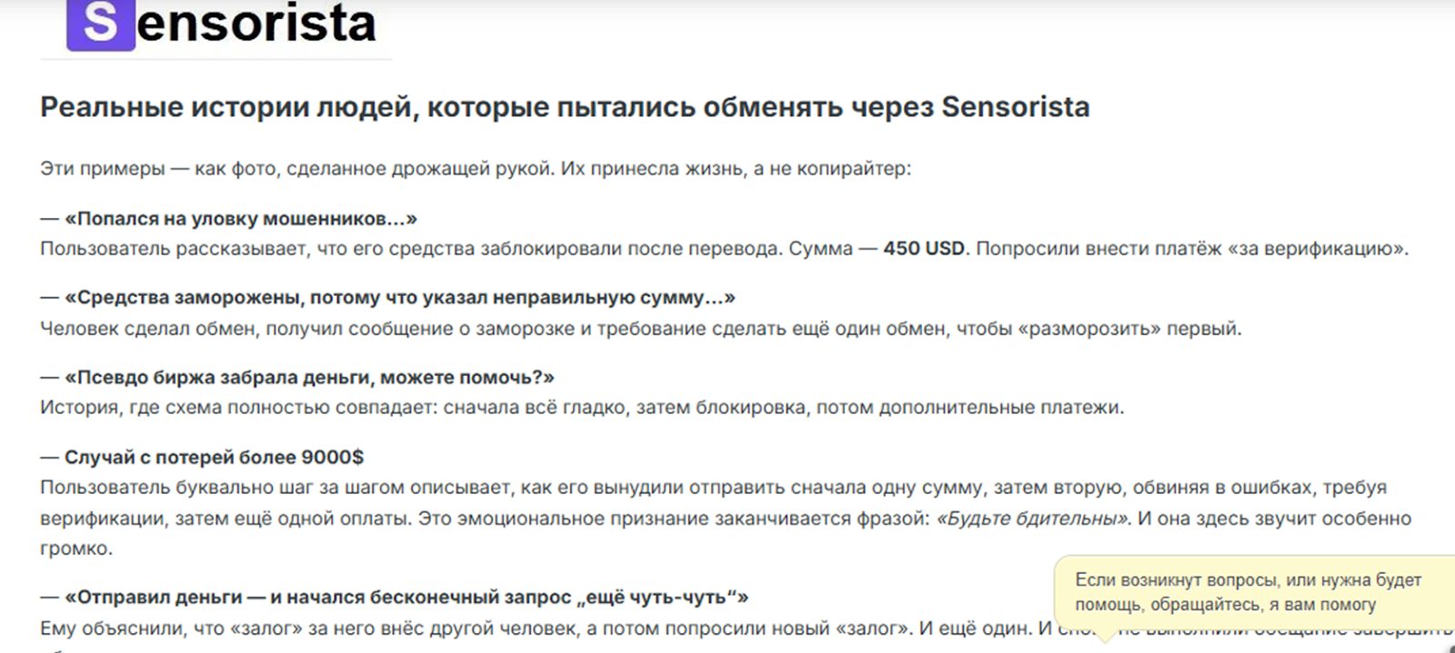 На обменник Sensorista com отзывов крайне мало, но все истории взаимодействия с сервисом негативные. Пользователи пишут о заморозке транзакций, проблемах с доступом к обменнику и мошенничестве создателей.