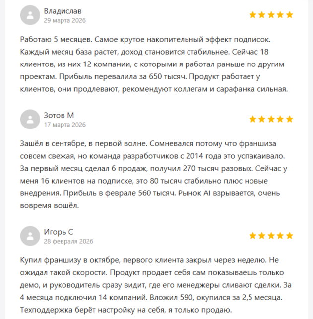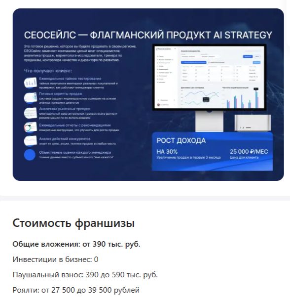 За упомянутые деньги ООО «ИИ Стратегия Сеосейлс» обеспечивает партнеру возможность получать с каждого клиента разовый платеж 45 000 рублей и 4 980 рублей абонентской платы. Чем больше клиентов, тем выше заработки покупателя франшизы.