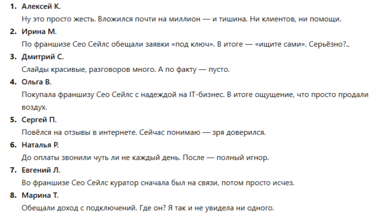 Нами были найдены и негативные комментарии о франшизе. Размещены они на сторонних ресурсах. В отрицательных отзывах партнеры ООО «ИИ Стратегия Сеосейлс» отмечают отсутствие клиентов, поддержки кураторов, а также реального дохода.