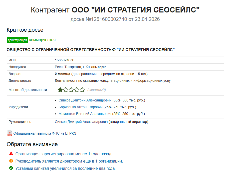 В процессе проверки данных об организации были выявлены следующие факты. ООО «ИИ Стратегия Сеосейлс» основано 28 января 2026 года. На момент обзора компании исполнилось 2 месяца. Организация имеет трех учредителей. Ее руководителем выступает Сивков Дмитрий Александрович. Уставной капитал компании составляет 1 000 000 рублей.