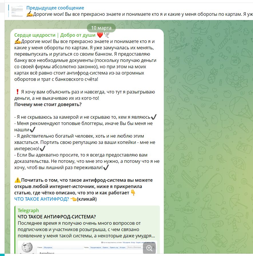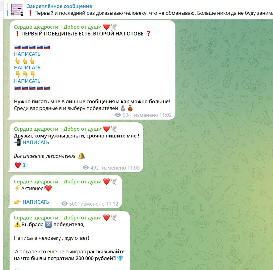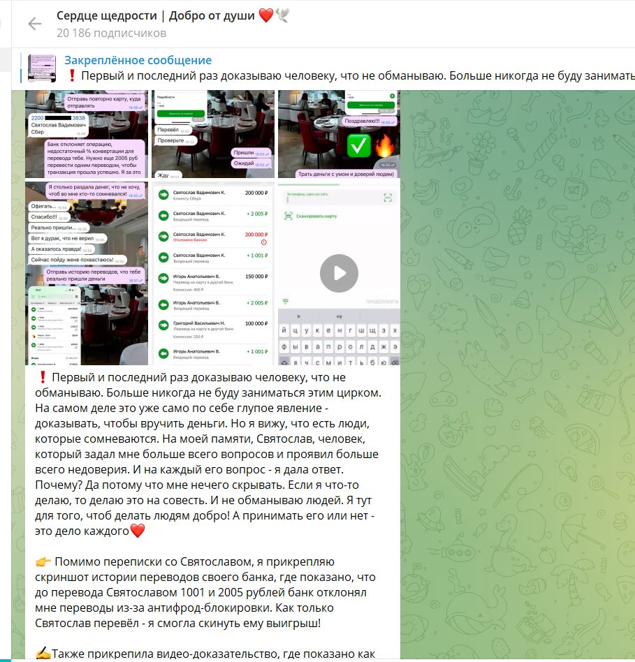 Канал “Сердце щедрости” не выглядит как благотворительный или инвестиционный проект. По совокупности признаков, отзывов и структуры работы это типичная схема псевдо-розыгрышей, где за словами о помощи скрывается сбор денег с подписчиков.
