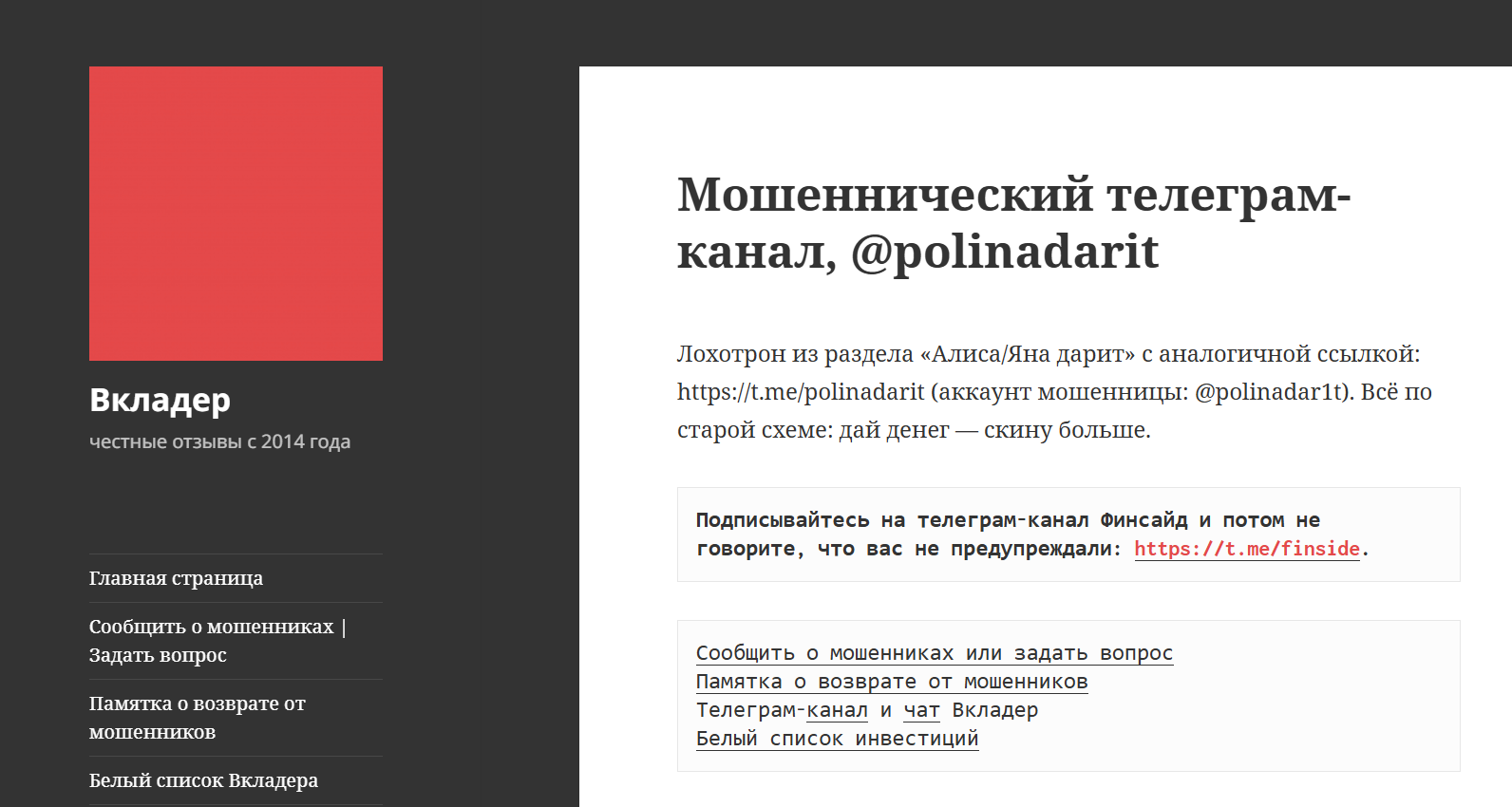 Отдельно проект уже разобран на специализированных ресурсах, которые отслеживают мошеннические схемы. Там прямо пишут о том, что “Сердце Щедрости Добро От Души” — скам и относят проект к категории “Полина/Алиса/Яна дарит”.