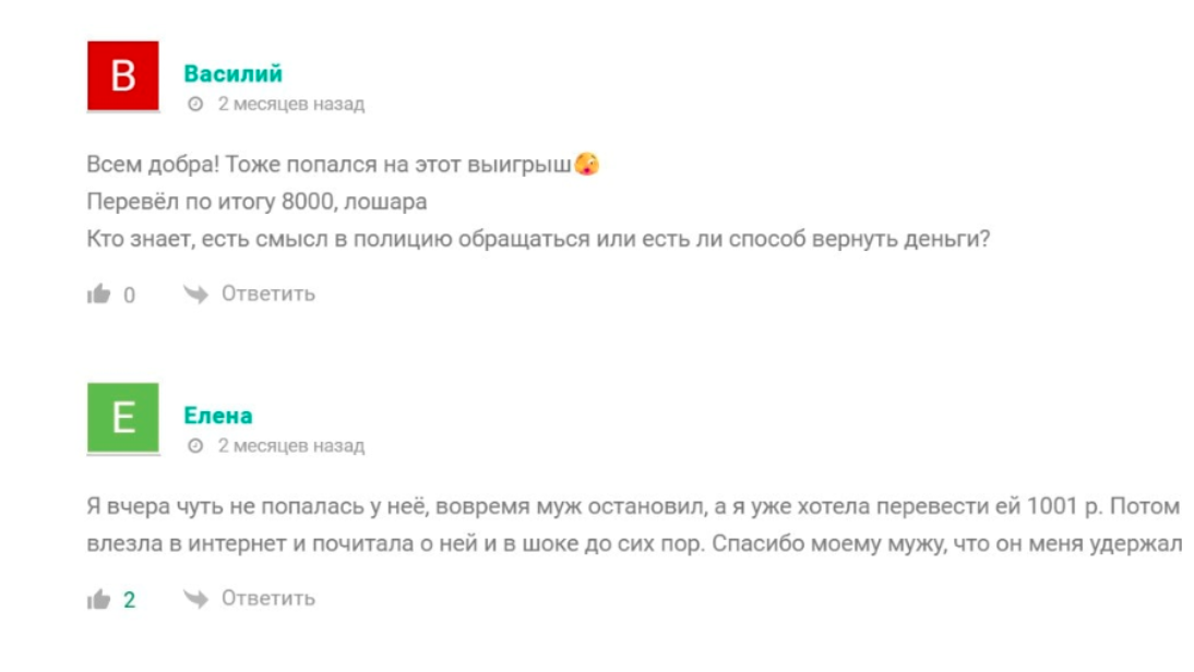 Есть отзывы, где люди прямо пишут, что потеряли деньги и задаются вопросом, есть ли смысл обращаться в полицию. Другие пишут, что чуть не попались, но вовремя остановились, прочитав информацию в интернете.