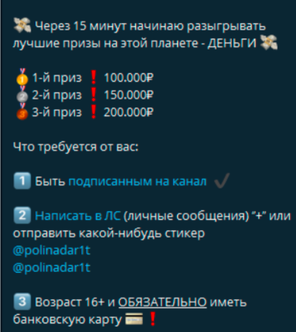 Публикуются анонсы розыгрышей с конкретными суммами: 100К, 150К и 200К рублей, иногда меньше, иногда больше. Условия участия всегда просты: быть подписанным, написать в личные сообщения, иногда поставить плюс или отправить стикер. Создается ощущение легкости и доступности — будто деньги реально раздаются просто так.