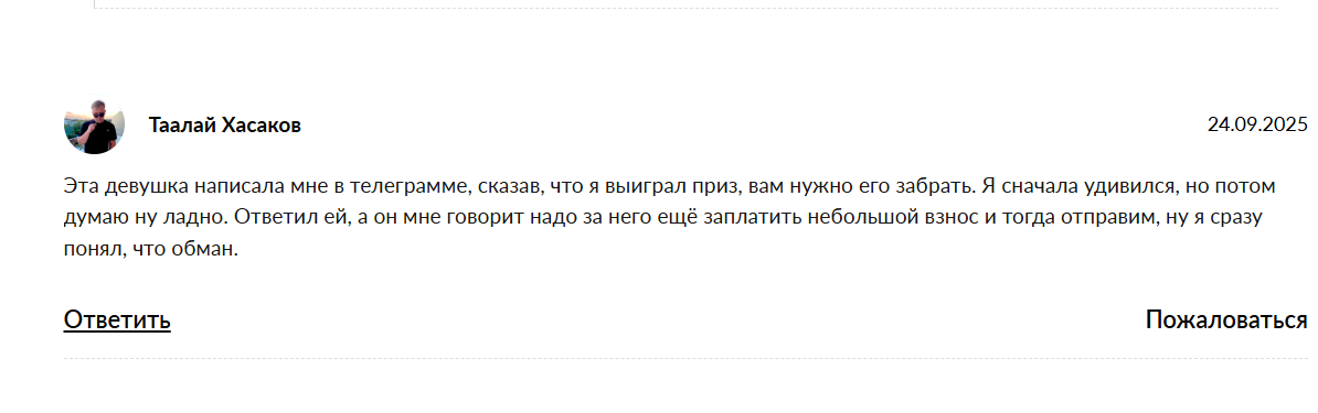 При этом за пределами тг отклики найти удалось. Они носят в основном негативный характер и описывают одну и ту же ситуацию. Человеку пишут, что он выиграл деньги, просят небольшой перевод для получения приза, после чего: либо выигрыш не приходит, либо появляются требования оплатить что-то еще.