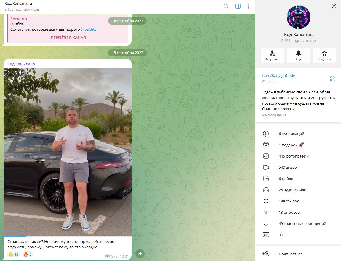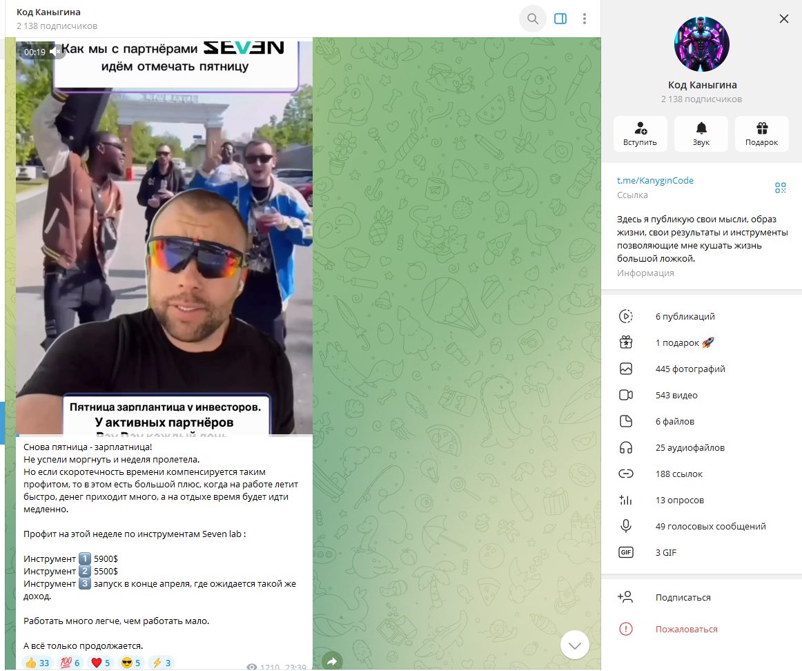 Основную деятельность мошенник развернул в Telegram, который он создал в ноябре 2021 года и назвал «Код Каныгина». Блогер набрал почти 2 тыс. подписчиков и регулярно обновляет ленту. Кроме рекламы сомнительных проектов, Сергей выкладывает фото из личной жизни в стиле инфоцыган, утверждая, что пришел к финансовой стабильности именно благодаря своим «инструментам». Комментарии под постами закрыты — это выглядит как попытка избежать критики.