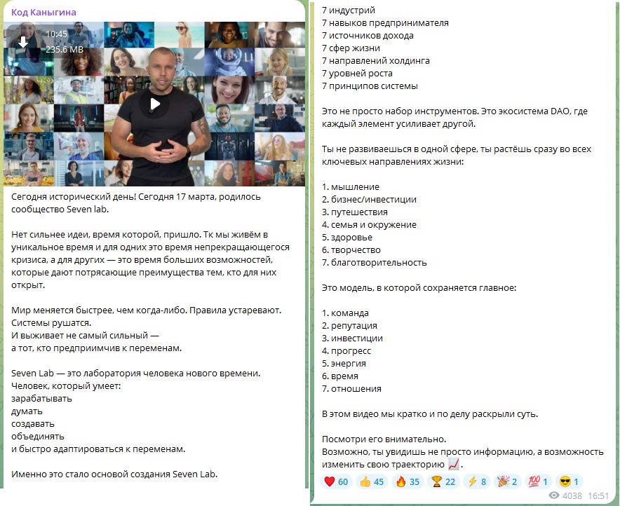 Получив деньги от рекламы Bitnest, Сергей бросил проект и 17 марта 2026 года начал рекламировать новую пирамиду — Seven Lab. Это молодой, но сомнительный сервис, о котором ничего не известно. Нет данных о владельцах, капитализации, лицензии и регистрации. В своих постах Каныгин оперирует общими терминами: «лаборатория человека нового мышления», «перспективная команда», «сильное комьюнити» и так далее. Чем конкретно занимается Seven Lab — не раскрывает.