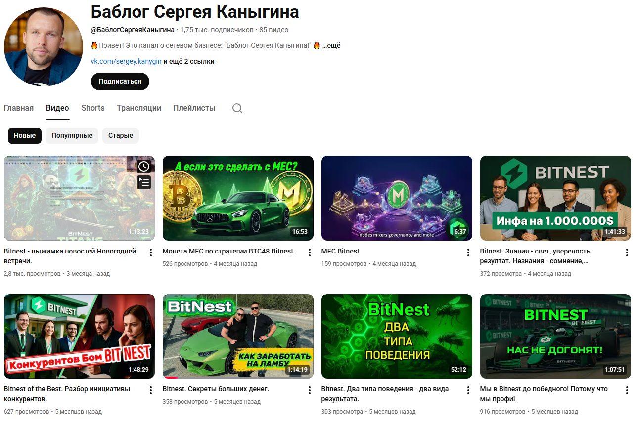 В начале 2026 года Сергей на своем Youtube-канале активно продвигал проект Bitnest и монету MEC. Для вовлечения клиентов он создал несколько роликов, в которых расхваливал платформу, обещая быстрый рост токена и огромную прибыль клиентам.