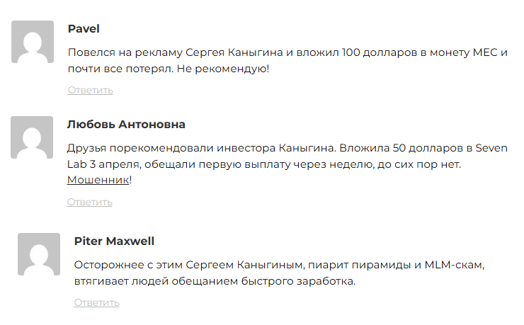 Мы не нашли в интернете свидетельств, что кто-то смог заработать на инвестиционных предложениях Сергея. В отзывах один негатив. В своих комментариях люди пишут, что доверились советам Каныгина и потеряли деньги.