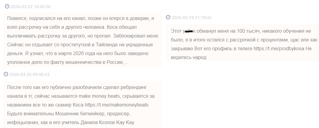 Граждане утверждают, что основатель тг-ресурса только собирает деньги, а сам образовательный процесс либо вовсе не начинается, либо горе-куратор предоставляет базовую информацию, никакого отношения к заработку не имеющую. Мошенник ProdByKosa разводит граждан на финансовые средства, предлагая оформлять рассрочку. Доверчивые пользователи оформляют кредиты, лишь бы только попасть на курсы успешного специалиста по заработку на музыке.