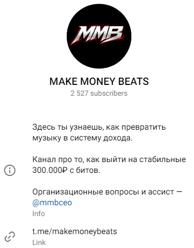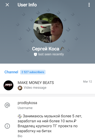 Предприниматель утверждает, что обладает 5-летним опытом работы в сфере музыки и заработал уже свыше 10 000 000 рублей на продаже битов и продюсировании артистов. В профиле успешного тг-персонажа закреплена ссылка на его бизнес-канал «Мэйк Мани Битс». На сообщество подписано 2 527 фолловеров.