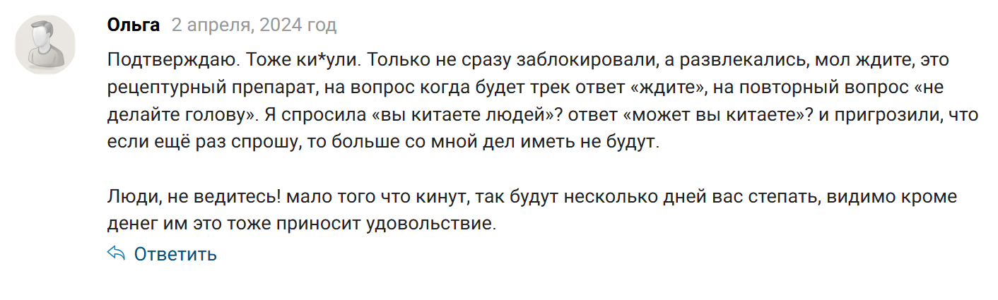 Некоторые клиенты заявляют, что после заказа администрация предлагает ожидать рецептурный препарат. При этом на вопросы об обмане следуют хамские ответы и угрозы.