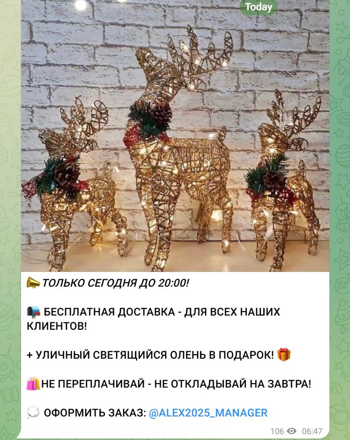 Иногда пользователям Шишка Маркет Литые Ели в ТГК предлагается приятный подарок. Один из таких сюрпризов — светящийся олень. При этом клиентам предлагают не переплачивать за покупку и не откладывать ее на завтра.