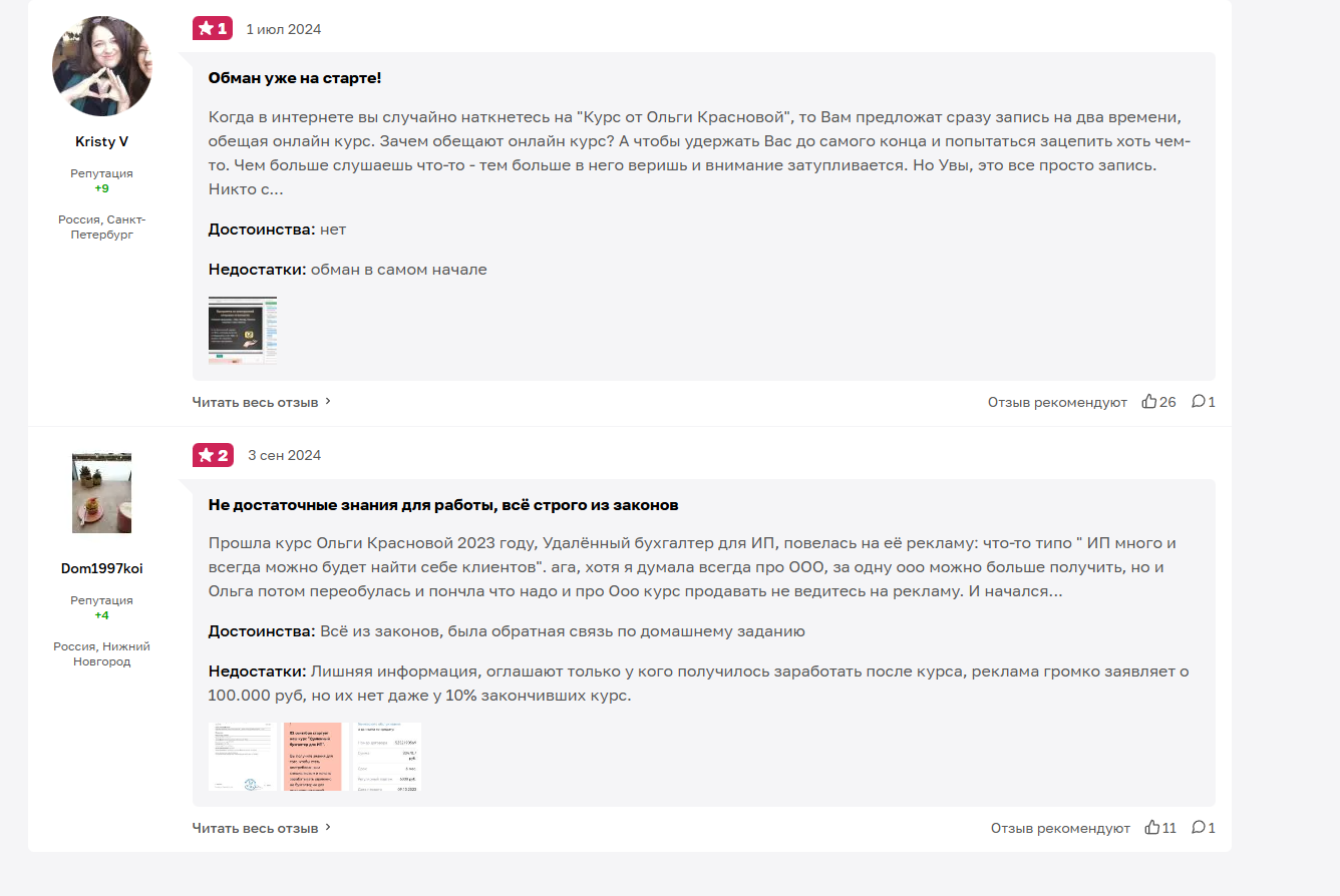 В негативных отзывах жалуются на высокую стоимость онлайн-курса «Удаленный бухгалтер» и на то, что Ольга Краснова практически не развивает тему по 3 НДФЛ. Некоторые указывают, что при оформлении покупки менеджеры активно подталкивают к оформлению кредита. Также клиенты считают, что без дополнительной практики с реальными документами выйти на стабильный доход сложно.