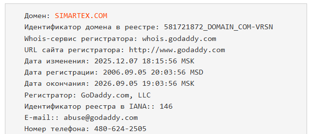 На Web Archive снимков не сохранилось, зато анализ домена Simartex com выявил, что его регистрация прошла в 2006 году, но 7.12.2025 произошли изменения, которые могут быть связаны с новым владельцем, а это говорит о слишком малом периоде существования и вызывает сомнения в порядочности создателей.