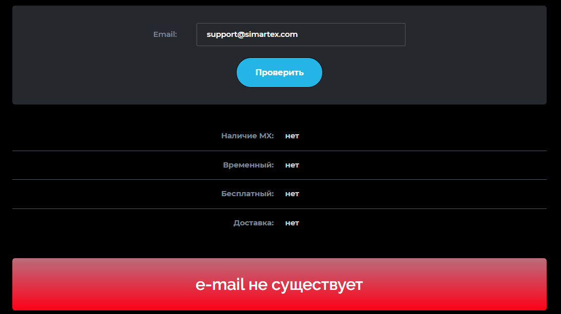 Так как сайт в марте 2026 года недоступен, то и указанный email тоже не должен работать, но мы все равно решили проверить его, а это только подтвердило догадки о том, что адрес недействителен.