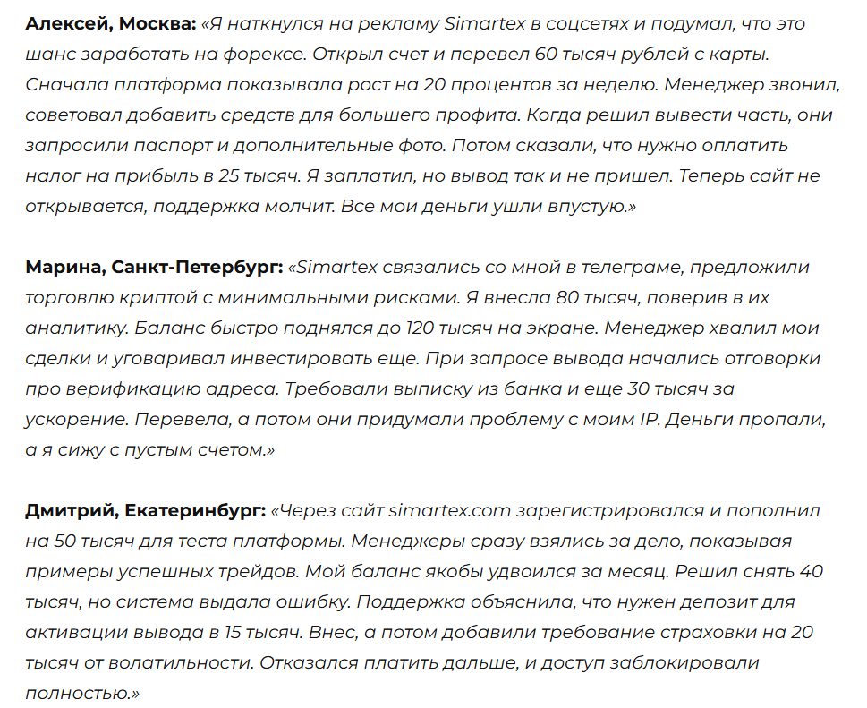 Пользователи считают, что брокер «Симартекс» фейковый, потому что он не предоставляет каких-либо доказательств порядочности, да и многие другие недостатки указывают на низкий уровень надежности, поэтому мы советуем отказаться от сотрудничества с ним, даже если сайт снова откроется.