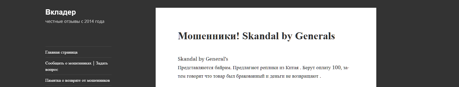 Показалось странным, что отзывы Skandal by generals ТГ канал получил только от одного покупателя на сайте «Вкладер». Пользователь сообщает, что мошенники получили предоплату, потом сказали, что товар бракованный и исчезли вместе с деньгами.