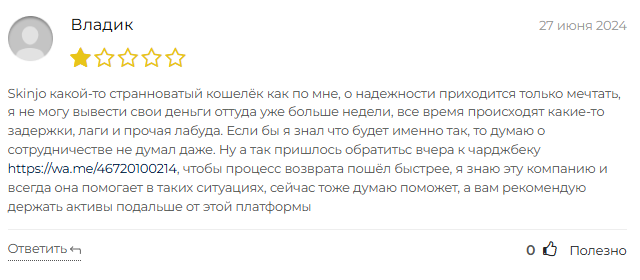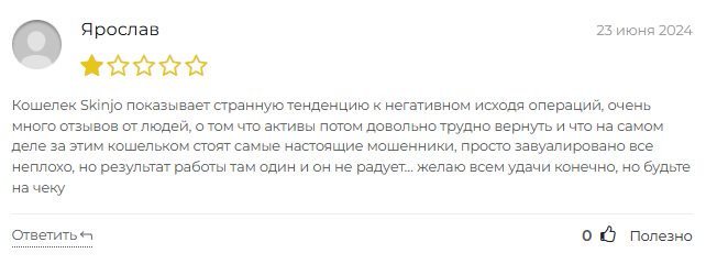 В сети можно найти немало отзывов о кошельке Skinjo. Практически все они негативные. Общая картина складывается очень тревожная.