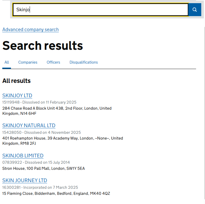 Теперь про регистрацию. Проект заявлял, что официально зарегистрирован в Великобритании. На сайте указывалась компания Skinjo GROUP LIMITED с номером 27148957. На первый взгляд все выглядит солидно и внушает доверие.