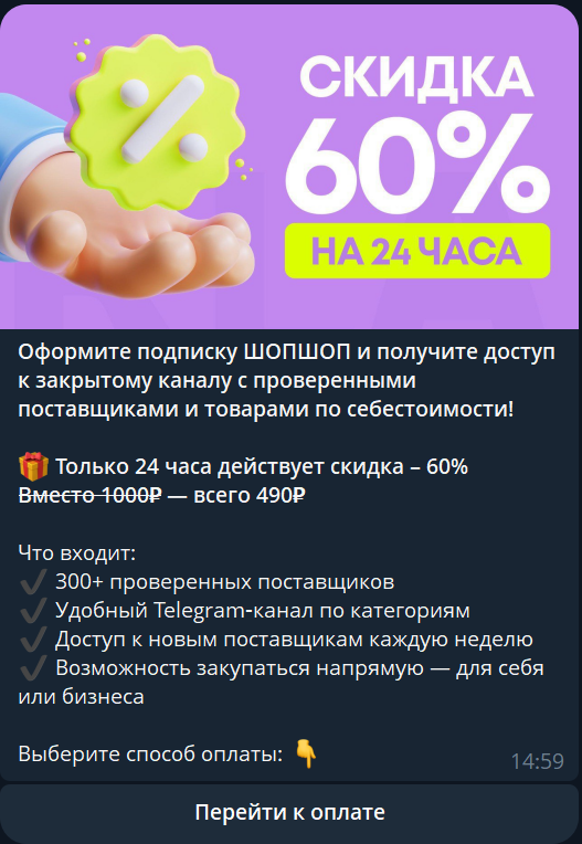 «Шопшоп» – бот в Телеграме, предлагающий разные товары по себестоимости. Доступ к нему можно получить только по платной подписке. Подробнее расскажем далее.