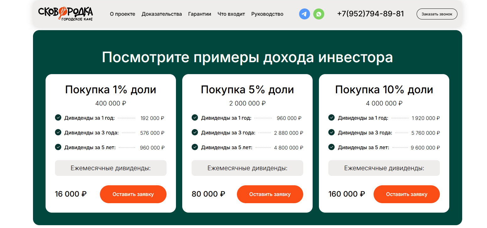 Помимо заработка от дивидендов, команда предлагает перепродавать свои акции по более высокой цене. Без анализа договора это уже указывает на модель сотрудничества: вы покупаете акции и получаете выплаты в дивидендах. Они напрямую зависят от доходности, а значит в случае падения сети кафе Сковородка 39, ваш пассивный доход тоже рухнет.