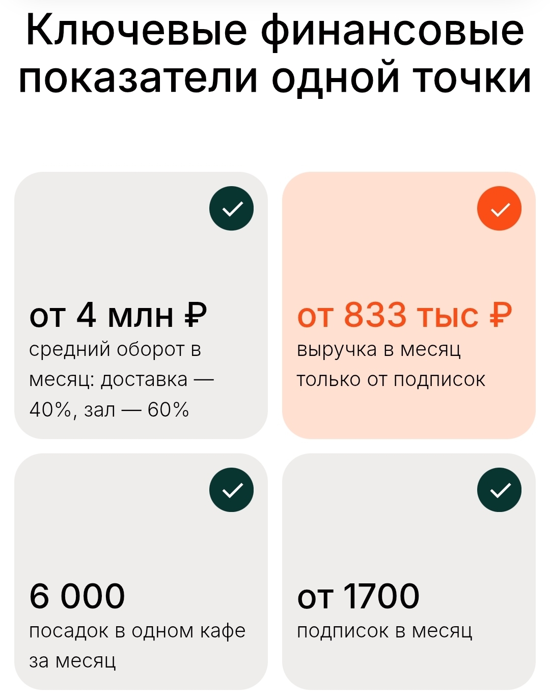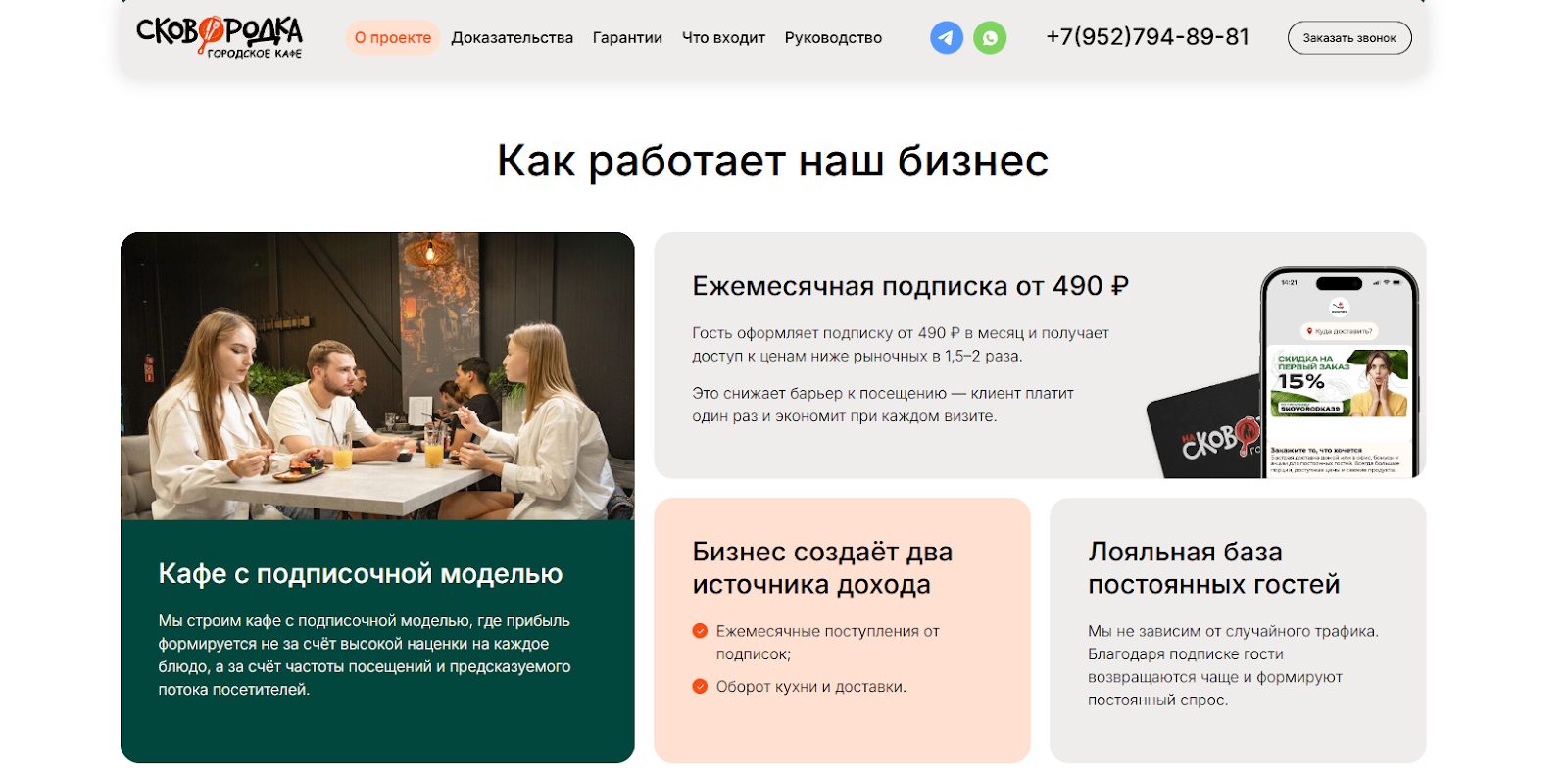 Модель включает подписку для гостей кафе по цене от 490 рублей в месяц. Подписчики получают скидки 25-50%, что в некоторых случаях делает стоимость блюд ниже рынка. Это повышает лояльность и обеспечивает стабильный поток дохода от двух источников: подписки и оборот кухни с доставкой.